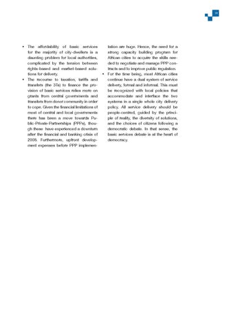 tation are huge. Hence, the need for a strong capacity building program for African cities to acquire the skills needed to negotiate and manage PPP contracts and to improve public regulation. For the time being, most African cities continue have a dual system of service delivery, formal and informal. This must be recognized with local policies that accommodate and interface the two systems in a single whole city delivery policy. All service delivery should be people-centred, guided by the principle of reality, the diversity of solutions, and the choices of citizens following a democratic debate. In that sense, the basic services debate is at the heart of democracy.