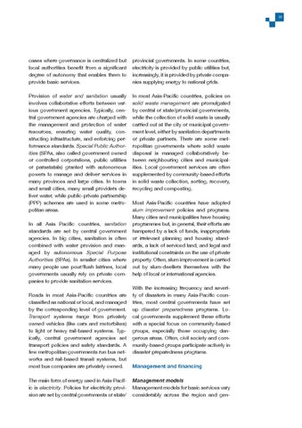 Most Asia-Pacific countries have adopted slum improvement policies and programs. Many cities and municipalities have housing programmes but, in general, their efforts are hampered by a lack of funds, inappropriate or irrelevant planning and housing standards, a lack of serviced land, and legal and institutional constraints on the use of private property. Often, slum improvement is carried out by slum-dwellers themselves with the help of local or international agencies. With the increasing frequency and severity of disasters in many Asia-Pacific countries, most central governments have set up disaster preparedness programs. Local governments supplement these efforts with a special focus on community-based groups, especially those occupying dangerous areas. Often, civil society and community-based groups participate actively in disaster preparedness programs. Management and financing Management models Management models for basic services vary considerably across the region and gen