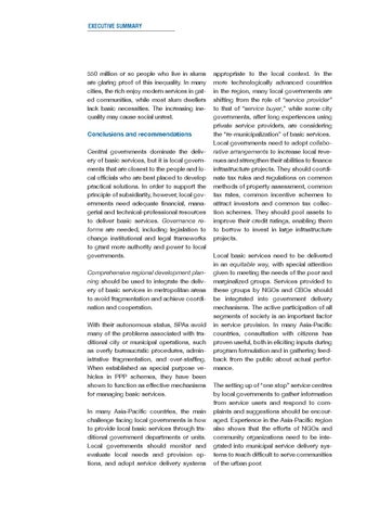550 million or so people who live in slums are glaring proof of this inequality. In many cities, the rich enjoy modern services in gated communities, while most slum dwellers lack basic necessities. The increasing inequality may cause social unrest. Conclusions and recommendations Central governments dominate the delivery of basic services, but it is local governments that are closest to the people and local officials who are best placed to develop practical solutions. In order to support the principle of subsidiarity, however, local governments need adequate financial, managerial and technical-professional resources to deliver basic services. Governance reforms are needed, including legislation to change institutional and legal frameworks to grant more authority and power to local governments. Comprehensive regional development planning should be used to integrate the delivery of basic services in metropolitan areas to avoid fragmentation and achieve coordination and cooperation. With their autonomous status, SPAs avoid many of the problems associated with traditional city or municipal operations, such as overly bureaucratic procedures, administrative fragmentation, and over-staffing. When established as special purpose vehicles in PPP schemes, they have been shown to function as effective mechanisms for managing basic services. In many Asia-Pacific countries, the main challenge facing local governments is how to provide local basic services through traditional government departments or units. Local governments should monitor and evaluate local needs and provision options, and adopt service delivery systems