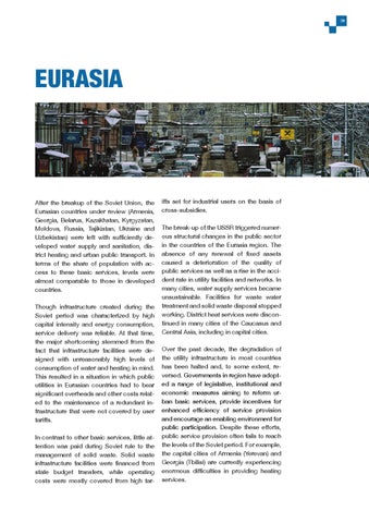 iffs set for industrial users on the basis of cross-subsidies. The break-up of the USSR triggered numerous structural changes in the public sector in the countries of the Eurasia region. The absence of any renewal of fixed assets caused a deterioration of the quality of public services as well as a rise in the accident rate in utility facilities and networks. In many cities, water supply services became unsustainable. Facilities for waste water treatment and solid waste disposal stopped working. District heat services were discontinued in many cities of the Caucasus and Central Asia, including in capital cities. Over the past decade, the degradation of the utility infrastructure in most countries has been halted and, to some extent, reversed. Governments in region have adopted a range of legislative, institutional and economic measures aiming to reform urban basic services, provide incentives for enhanced efficiency of service provision and encourage an enabling environment for public participation. Despite these efforts, public service provision often fails to reach the levels of the Soviet period. For example, the capital cities of Armenia (Yerevan) and Georgia (Tbilisi) are currently experiencing enormous difficulties in providing heating services.