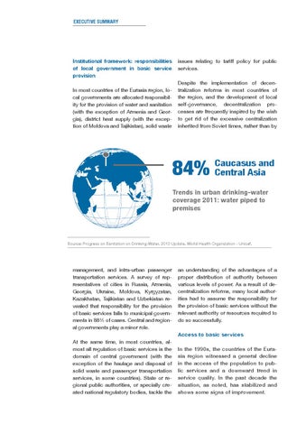 Institutional framework: responsibilities of local government in basic service 足provision In most countries of the Eurasia region, local governments are allocated responsibility for the provision of water and sanitation (with the exception of Armenia and Georgia), district heat supply (with the exception of Moldova and Tajikistan), solid waste