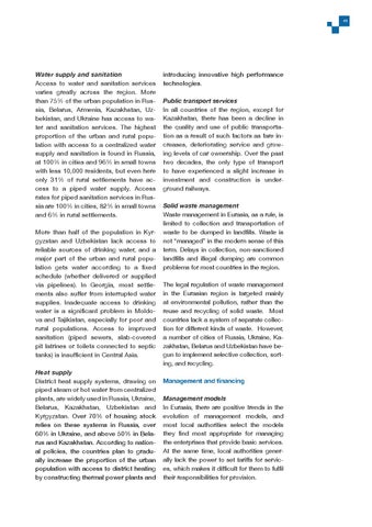 introducing innovative high performance technologies. Public transport services In all countries of the region, except for Kazakhstan, there has been a decline in the quality and use of public transportation as a result of such factors as fare increases, deteriorating service and growing levels of car ownership. Over the past two decades, the only type of transport to have experienced a slight increase in investment and construction is underground railways. Solid waste management Waste management in Eurasia, as a rule, is limited to collection and transportation of waste to be dumped in landfills. Waste is not “managed” in the modern sense of this term. Delays in collection, non-sanctioned landfills and illegal dumping are common problems for most countries in the region. The legal regulation of waste management in the Eurasian region is targeted mainly at environmental pollution, rather than the reuse and recycling of solid waste. Most countries lack a system of separate collection for different kinds of waste. However, a number of cities of Russia, Ukraine, Kazakhstan, Belarus and Uzbekistan have begun to implement selective collection, sort ing, and recycling. Management and financing Management models In Eurasia, there are positive trends in the evolution of management models, and most local authorities select the models they find most appropriate for managing the enterprises that provide basic services. At the same time, local authorities generally lack the power to set tariffs for services, which makes it difficult for them to fulfil their responsibilities for provision.