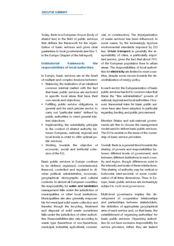 Today, there is a European Acquis (body of shared law) in the field of public services that defines the framework for the organ ization of basic services and gives clear guarantees to local governments (see Box 1. in the Europe Chapter of the full report). Institutional framework: the responsibilities of local authorities In Europe, basic services are at the heart of multiple and complex tensions between: Balancing the realization of an idealized common internal market with the fact that basic public services are anchored in specific local areas that have their own needs and objectives; Fulfilling public service obligations, in general and for each precise sector, to carry out “particular tasks” defined by public authorities to meet general interest objectives; Implementing the subsidiarity principle in the context of shared authority between European, national, regional and local levels in order to offer optimal public services; Working towards the objective of econom ic, social and territorial cohesion of the EU. Basic public services in Europe continue to be defined, organized, commissioned, financed, controlled and regulated in diverse political, administrative, economic, geograph ical, demographic and cultural contexts. In almost all European countries, the responsibility for water and sanitation management falls under the jurisdiction of municipalities or other local institutions. Municipalities are also generally responsible for municipal solid waste collection and transfer, though the recycling, treatment and disposal of solid waste sometimes falls under the jurisdiction of other authorities. Responsibilities also vary according to waste type (hazardous or non-hazardous, municipal, industrial, agricultural, commer-