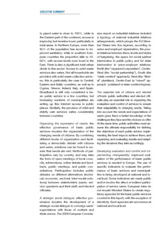 to piped water is close to 100%, while in the Eastern part of the continent, access is improving but remains lower, particularly in rural areas. In Northern Europe, more than 85% of the population has access to im proved sanitation, while in southern European countries the proportion falls to 4060%, with access levels even lower in the East. There is also a significant rural-urban divide in this sector. Access to solid waste services also varies. Not all households are provided with solid waste collection services; this is particularly the case in Central, Eastern and Baltic countries, as well as in Cyprus, Greece, Ireland, Italy, and Spain. Broadband is still only considered a basic public service in a few countries, but increasing numbers of municipalities are setting up free Internet access in public places. Similarly, the provision of child and elderly care services varies considerably between countries. Organizing the expression of needs: the effective governance of basic public services requires the organization of the changing needs of citizens. By combining different levels of organization and facilitating a democratic debate with citizens and users, solutions can be found to ensure that needs are met. Methods of participation vary by country, and may take the form of open meetings of local councils, referendums, online debate and feedback, public meetings, and public consultations. Participation includes public debates on different alternatives (technical, economic, sectoral, inter-modal solutions) between stakeholders (users, service operators and their s taff, and elected officials). A strategic social dialogue: effective governance requires the development of a strategic social dialogue to converge users’ expectations with those of workers and trade unions. The 2008 European Commis-
