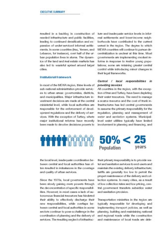 ture and inadequate service levels in informal settlements and lower-income neighborhoods have contributed to the current unrest in the region. The degree to which MEWA countries will continue to pursue decentralization is unclear at this time. Most governments are implementing modest reforms in response to restive young populations; some are retaining greater central control while introducing minor changes in their legal frameworks.