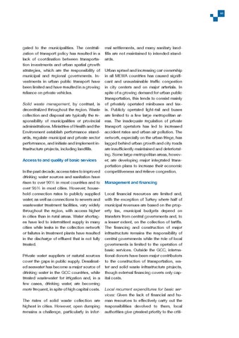 gated to the municipalities. The centralization of transport policy has resulted in a lack of coordination between transportation investments and urban spatial growth strategies, which are the responsibility of municipal and regional governments. Investments in urban public transport have been limited and have resulted in a growing reliance on private vehicles. Solid waste management, by contrast, is decentralized throughout the region. Waste collection and disposal are typically the responsibility of municipalities or provincial administrations. Ministries of Health and the Environment establish performance standards, regulate municipal and private sector performance, and initiate and implement infrastructure projects, including landfills. Access to and quality of basic services In the past decade, access rates to improved drinking water sources and sanitation have risen to over 90% in most countries and to over 95% in most cities. However, household connection rates to publicly supplied water, as well as connections to sewers and wastewater treatment facilities, vary widely throughout the region, with access higher in cities than in rural areas. Water shortages have led to intermittent supply in many cities while leaks in the collection network or failures in treatment plants have resulted in the discharge of effluent that is not fully treated. Private water suppliers or natural sources cover the gaps in public supply. Desalinated seawater has become a major source of drinking water in the GCC countries, while treated wastewater for irrigation and, in a few cases, drinking water, are becoming more frequent, in spite of high capital costs. The rates of solid waste collection are highest in cities. However, open dumping remains a challenge, particularly in infor-