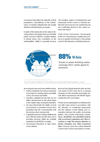 cal services that affect the daily life of their populations. Expenditures on the maintenance of existing infrastructure are usually deferred until absolutely necessary. In spite of the steady rise in the value of developed land, real estate taxes provide little public revenue in MEWA countries relative to global norms. Key constraints on the municipalities’ ability to generate revenue