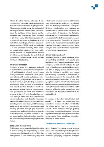 other waste services happens at the local level, with some subsidies and regulations from the federal governments. Multi-jurisdictional collaboration and partnerships and the use of private sector providers are common in both countries. The full-scale contracting out of solid waste management services is particularly common among U.S. local governments. Several local governments in the region are increasingly experimenting with new waste-to-energy technologies and cradle-to-cradle approaches to solid waste management. Energy and broadband Although pivotal to local residents, energy (including electricity and natural gas) and broadband/telecommunications technologies, operate mostly outside the purview of local governments in North America. This is largely due to issues of scale, with the delivery of electricity and natural gas spanning continents or, in the case of broadband, much of the populated world. Issues of geographical scale, in fact, likely explain why the delivery of water-supply and sanitation systems is almost always a state/provincial-local responsibility in North America while electricity, natural gas, and broadband are typically addressed at the national level. In contrast to the other infrastructure categories, U.S. electricity, natural gas and broadband services are often provided by the private sector. Few local governments provide these services through publicly owned and operated enterprises. However, regardless of the provider, federal and state governments have significant regulatory authority in these sectors. Existing and emerging challenges
