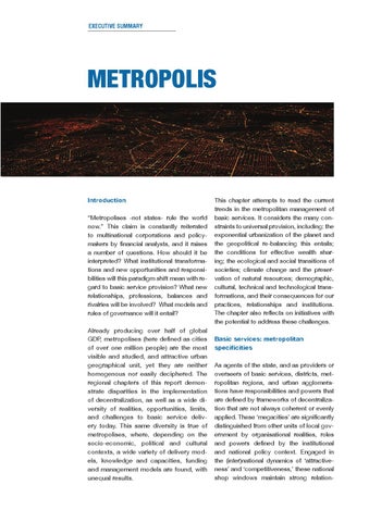 Introduction “Metropolises -not states- rule the world now.” This claim is constantly reiterated to multinational corporations and policymakers by financial analysts, and it raises a number of questions. How should it be interpreted? What institutional transformations and new opportunities and responsibilities will this paradigm shift mean with regard to basic service provision? What new relationships, professions, balances and rivalries will be involved? What models and rules of governance will it entail? Already producing over half of global GDP, metropolises (here defined as cities of over one million people) are the most visible and studied, and attractive urban geographical unit, yet they are neither homogenous nor easily deciphered. The regional chapters of this report demonstrate disparities in the implementation of decentralization, as well as a wide diversity of realities, opportunities, limits, and challenges to basic service delivery today. This same diversity is true of metropolises, where, depending on the socio-economic, political and cultural contexts, a wide variety of delivery models, knowledge and capacities, funding and management models are found, with unequal results.