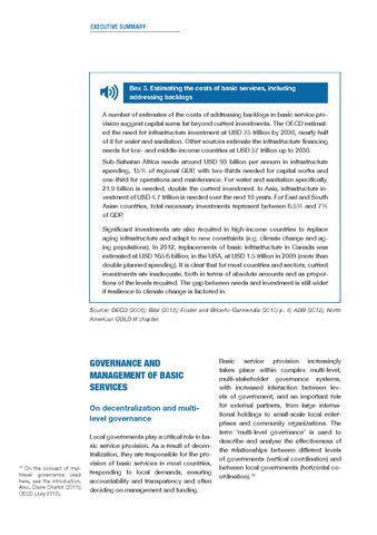 Box 3. Estimating the costs of basic services, including addressing backlogs A number of estimates of the costs of addressing backlogs in basic service provision suggest capital sums far beyond current investments. The OECD estimated the need for infrastructure investment at USD 75 trillion by 2030, nearly half of it for water and sanitation. Other sources estimate the infrastructure financing needs for low- and middle-income countries at USD 57 trillion up to 2030. Sub-Saharan Africa needs around USD 93 billion per annum in infrastructure spending, 15% of regional GDP, with two-thirds needed for capital works and one-third for operations and maintenance. For water and sanitation specifically, 21.9 billion is needed, double the current investment. In Asia, infrastructure investment of USD 4.7 trillion is needed over the next 10 years. For East and South Asian countries, total necessary investments represent between 6.5% and 7% of GDP. Significant investments are also required in high-income countries to replace aging infrastructure and adapt to new constraints (e.g. climate change and aging populations). In 2012, replacements of basic infrastructure in Canada was estimated at USD 165.6 billion; in the USA, at USD 1.5 trillion in 2009 (more than double planned spending). It is clear that for most countries and sectors, current investments are inadequate, both in terms of absolute amounts and as proportions of the levels required. The gap between needs and investment is still wider if resilience to climate change is factored in. Source: OECD (2006); Bilal (2013); Foster and Briceño-Garmendia (2010) p. 8; ADB (2012); North American GOLD III chapter.