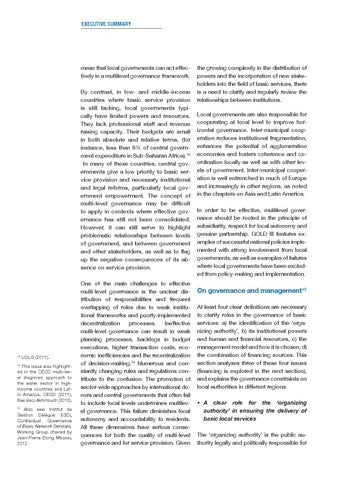 the growing complexity in the distribution of powers and the incorporation of new stakeholders into the field of basic services, there is a need to clarify and regularly review the relationships between institutions. Local governments are also responsible for cooperating at local level to improve horizontal governance. Inter-municipal cooperation reduces institutional fragmentation, enhances the potential of agglomeration economies and fosters coherence and coordination locally as well as with other levels of government. Inter-municipal cooperation is well entrenched in much of Europe and increasingly in other regions, as noted in the chapters on Asia and Latin America. In order to be effective, multilevel governance should be rooted in the principle of subsidiarity, respect for local autonomy and genuine partnership. GOLD III features examples of successful national policies implemented with strong involvement from local governments, as well as examples of failures where local governments have been excluded from policy-making and implementation.