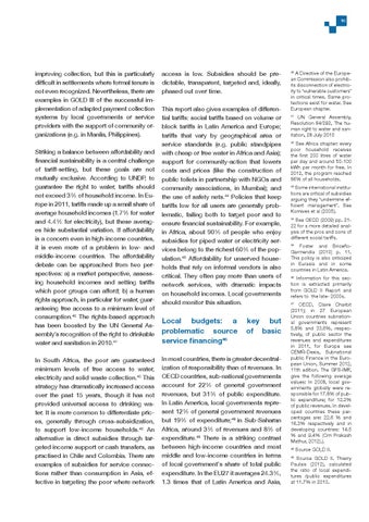 improving collection, but this is particularly difficult in settlements where formal tenure is not even recognized. Nevertheless, there are examples in GOLD III of the successful implementation of adapted payment collection systems by local governments or service providers with the support of community organizations (e.g. in Manila, Philippines). Striking a balance between affordability and financial sustainability is a central challenge of tariff-setting, but these goals are not mutually exclusive. According to UNDP, to guarantee the right to water, tariffs should not exceed 3% of household income. In Europe in 2011, tariffs made up a small share of average household incomes (1.7% for water and 4.4% for electricity), but these averages hide substantial variation. If affordability is a concern even in high-income countries, it is even more of a problem in low- and middle-income countries. The affordability debate can be approached from two perspectives: a) a market perspective, assessing household incomes and setting tariffs which poor groups can afford; b) a human rights approach, in particular for water, guaranteeing free access to a minimum level of consumption.40 The rights-based approach has been boosted by the UN General Assembly’s recognition of the right to drinkable water and sanitation in 2010.41 In South Africa, the poor are guaranteed minimum levels of free access to water, electricity and solid waste collection.42 This strategy has dramatically increased access over the past 15 years, though it has not provided universal access to drinking water. It is more common to differentiate prices, generally through cross-subsidization, to support low-income households.43 An alternative is direct subsidies through targeted income support or cash transfers, as practised in Chile and Colombia. There are examples of subsidies for service connections rather than consumption in Asia, effective in targeting the poor where network
