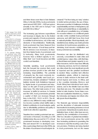 creased).53 Far from being an ‘easy’ solution to better service provision, the use of transfers poses a number of challenges, including unpredictability and lack of transparency (as in West and Central Africa); or vulnerability to cuts with poor consultation (e.g. in Eurasia). An excessive reliance on conditional grants can also overly constrain local government autonomy and shift their focus from local to national priorities. Most importantly, substantial revenue-sharing can create perverse incentives for local revenue generation, undermining local resource mobilization and local government accountability. Resources can also be distributed very unevenly, concentrated in main cities and central regions. Large cities, with their larger fiscal bases and greater capacity to mobilize resources, tend to have less difficulty in financing services, but it is in intermediary cities where the most significant growth is expected and the greatest investment is needed. Many countries lack effective equalization grants, critical to improving access to basic services in the least wellserved regions and towns. In Africa, just a few countries (including Morocco and South Africa) have introduced such mechanisms, and in the Middle East and West Asia there are none. The situation is a little better in Latin America. Some Asian countries use equalization transfers (e.g. Australia, Indonesia, and Japan), but others virtually ignore fiscal disparities. The financial gap between responsibility and the devolution of adequate revenues has resulted in increasing pressures on local government. Global trends towards decentralization have, in fact, often been accompanied by the centralization of revenues.54 After two decades of gradual decentralization, local governments across the world face increasing problems in generating the revenues to meet the recurring costs of service provision. Problems are being handed to local governments, but not the means