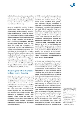 Borrowing and other alternatives for basic service financing Public financing through borrowing, local taxes and tariffs has been the backbone of most infrastructure investment in Western cities over the past two centuries. Municipalities have led the process, supported by central governments.55 In emerging countries today, many cities are borrowing to expand provision, and their traditional options are loans and, in some countries, debt obligations on the markets (bonds). Other financing models include land value capture (see Box 4) and PPPs, which have not completely fulfilled the high expectations many had for them (see below ‘partnership with private sector’).