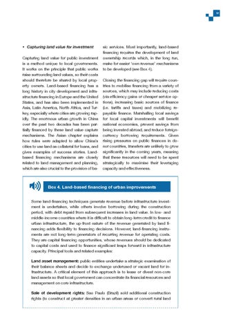 Box 4. Land-based financing of urban improvements Some land-financing techniques generate revenue before infrastructure investment is undertaken, while others involve borrowing during the construction period, with debt repaid from subsequent increases in land value. In low- and middle-income countries where it is difficult to obtain long-term credit to finance urban infrastructure, the up-front nature of the revenue generated by land financing adds flexibility to financing decisions. However, land-financing instruments are not long-term generators of recurring revenue for operating costs. They are capital financing opportunities, whose revenues should be dedicated to capital costs and used to finance significant leaps forward in infrastructure capacity. Principal tools and related examples: Land asset management: public entities undertake a strategic examination of their balance sheets and decide to exchange underused or vacant land for infrastructure. A critical element of this approach is to lease or divest non-core land assets so that local government can concentrate its financial resources and management on core infrastructure. Sale of development rights: Sao Paulo (Brazil) sold additional construction rights (to construct at greater densities in an urban areas or convert rural land