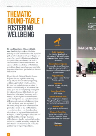 Thematic Round-Table 1 Fostering Wellbeing speakers Mayor of Casablanca, Mohamed Sajid, described his city’s work on affordable housing for slum-dwellers which has improved 70% of informal settlements over the past ten years. They have tried to improve planning and provide basic services such as health and education to informal settlements. He agreed with the conclusions of the GOLD III report that planning and financing need to be improved at local level, particularly in the area of transport. Miguel Lifschitz, National Senator, Former Mayor of Rosario argued that tackling inequality was fundamental to improving wellbeing, particularly in Latin America. We have four goals to improve services: 1) Enhance service quality for all social sectors using good mid and long term planning and investment. Use new ICT technologies and innovation in the aim of improving service quality – especially in transport and solid waste management and sanitation services 2) Ensure universal access to basic services – this has almost been accomplished. 3) Financing using cross-subsidies from more profitable services to less profitable ones – or within services – e.g. those travelling short distances pay proportionally more for transport, subsidising the poor who live in the outskirts and travel longer distances. 4) Use basic services for territorial integration and social cohesion, especially transport. He said that the GOLD III report will be a useful political tool in improving wellbeing.