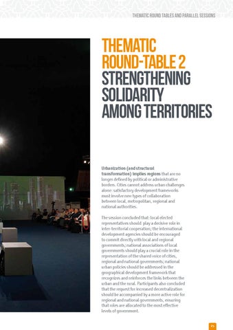 Thematic Round-Table 2 Strengthening solidarity among territories Urbanization (and structural transformation) implies regions that are no longer defined by political or administrative borders. Cities cannot address urban challenges alone: satisfactory development frameworks must involve new types of collaboration between local, metropolitan, regional and national authorities. The session concluded that: local elected representatives should play a decisive role in inter-territorial cooperation; the international development agencies should be encouraged to commit directly with local and regional governments; national associations of local governments should play a crucial role in the representation of the shared voice of cities, regional and national governments; national urban policies should be addressed in the geographical development framework that recognizes and reinforces the links between the urban and the rural. Participants also concluded that the request for increased decentralization should be accompanied by a more active role for regional and national governments, ensuring that roles are allocated to the most effective levels of government. 25
