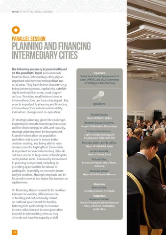 Planning and Financing intermediary cities The following summary is presented based on the panellists’ input and comments from the floor. Intermediary cities play an important role between metropolitan and rural areas. They have diverse characters e.g. being university towns, capital city, satellite city to metropolitan areas, rural support centres. Providing small interventions in intermediary cities can have a big impact. Key aspects important to planning and financing intermediary cities include sustainability, innovation, dialogue and co-operation. On strategic planning, given the challenges beginning to emulate in metropolitan areas and the shortcomings in skills and capacity, strategic planning must be incorporated. Accurate information on population and other vital issues to ensure better decision making, and being able to raise revenue must be highlighted. Innovation is important because intermediary cities do not have access to large sums of funding like metropolitan areas. Community involvement in planning is important, including by providing opportunities for labour to participate, especially on economic issues and job creation. Strategic emphasis can be focussed on one or two topics like tourism, or agribusiness. On financing, there is a need to be creative/ innovate in sourcing different sources of funding and not be heavily reliant on national government for funding. Entering into partnerships to increase income collection and income generation is useful in intermediary cities as they often do not have the capacity or skill