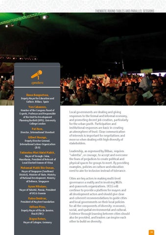 Local governments are dealing and giving responses to the formal and informal economy, and promoting decent job creation, particularly for the urban youth. Participation and institutional responses are basic in creating an atmosphere of trust. Clear communication of interests is important for negotiations and more so when dealing with high diversity of stakeholders. Leadership, as expressed by Bilbao, requires “valentia”, or courage, to accept and overcome the fears of prejudices to create political and physical spaces for groups to meet. By providing examples, policies on culture and education need to aim for inclusion instead of tolerance. Cities are key actors in making multi-level governance a reality and in involving NGOs and grassroots organizations. UCLG will continue to provide a platform for mayors and all development actors and should give clear and coherent recommendations to guide cities and local governments on their local policies for all the components of diversity: economic, social, and spatial environmental and cultural. Evidence through learning between cities should also be provided, and leaders can inspire each other to build on diversity. 39
