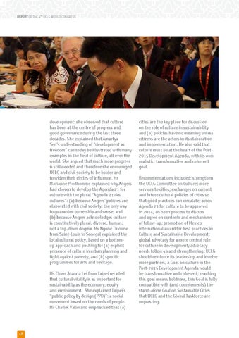 development: she observed that culture has been at the centre of progress and good governance during the last three decades. She explained that Amartya Sen’s understanding of “development as freedom” can today be illustrated with many examples in the field of culture, all over the world. She argued that much more progress is still needed and therefore she encouraged UCLG and civil society to be bolder and to widen their circles of influence. Ms Marianne Prodhomme explained why Angers had chosen to develop the Agenda 21 for culture with the plural “Agenda 21 des cultures”: (a) because Angers’ policies are elaborated with civil society; the only way to guarantee ownership and sense, and (b) because Angers acknowledges culture is constitutively plural, diverse, human; not a top-down dogma. Ms Ngoné Thioune from Saint-Louis in Senegal explained the local cultural policy, based on a bottomup approach and pushing for (a) explicit presence of culture in urban planning and fight against poverty, and (b) specific programmes for arts and heritage. Ms Chien Joanna Lei from Taipei recalled that cultural vitality is as important for sustainability as the economy, equity and environment. She explained Taipei’s “public policy by design (PPD)”: a social movement based on the needs of people. Mr Charles Vallerand emphasised that (a)