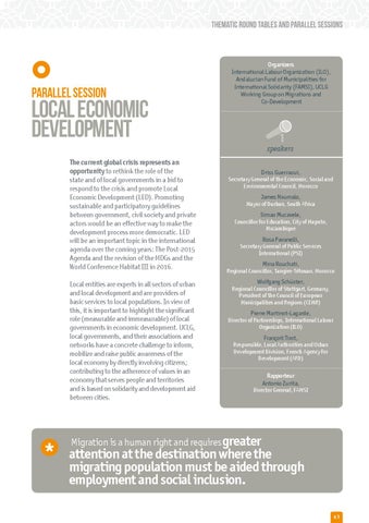 speakers The current global crisis represents an opportunity to rethink the role of the state and of local governments in a bid to respond to the crisis and promote Local Economic Development (LED). Promoting sustainable and participatory guidelines between government, civil society and private actors would be an effective way to make the development process more democratic. LED will be an important topic in the international agenda over the coming years: The Post-2015 Agenda and the revision of the MDGs and the World Conference Habitat III in 2016. Local entities are experts in all sectors of urban and local development and are providers of basic services to local populations. In view of this, it is important to highlight the significant role (measurable and immeasurable) of local governments in economic development. UCLG, local governments, and their associations and networks have a concrete challenge to inform, mobilize and raise public awareness of the local economy by directly involving citizens; contributing to the adherence of values in an economy that serves people and territories and is based on solidarity and development aid between cities.