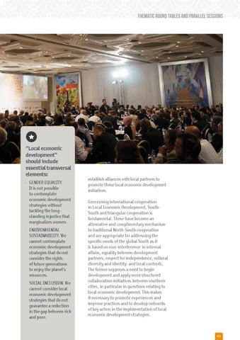 establish alliances with local partners to promote these local economic development initiatives. Concerning international cooperation in Local Economic Development, SouthSouth and triangular cooperation is fundamental. These have become an alternative and complimentary mechanism to traditional North-South cooperation and are appropriate for addressing the specific needs of the global South as it is based on non-interference in internal affairs, equality between development partners, respect for independence, cultural diversity and identity: and local contents. The former supposes a need to begin development and apply more structured collaboration initiatives between southern cities, in particular in questions relating to local economic development. This makes it necessary to promote experiences and improve practices and to develop networks of key actors in the implementation of local economic development strategies.