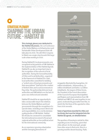 Shaping the Urban Future - Habitat III This strategic plenary was dedicated to the Habitat III process, the 3rd Conference of the United Nations on Infrastructure and Sustainable Urban Development that will take place in 2016. The 4th UCLG Congress in Rabat was a major step towards this largescale urban meeting in 2016. During Habitat II, local governments were recognized as key partners of UN-Habitat in the implementation of the Habitat Agenda. Habitat II was also an important step in the recognition of the network of local authorities. During the General Assembly of Cities and Local Authorities, organized in the framework of Habitat II in 1996, local authorities committed to building a “united voice of local governments and their associations” that led to the creation of United Cities and Local Governments in May 2004. The partnership between local authorities and UN Habitat over the last 20 years was reinforced and extended. Habitat III should be an opportunity to take a measurable step in the relations between the United Nations and local governments through the recognition of a special status including a more direct role and responsibilities vis-à-vis the decision making bodies of UN Habitat. Habitat III will also be a moment to consolidate the international movement of local and regional authorities as true political actors for the international community. As we experience growing urbanization and the emerging phenomena of