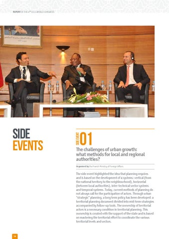 The side event highlighted the idea that planning requires and is based on the development of 4 systems: vertical (from the national territory to the neighbourhood), horizontal (between local authorities), inter-technical sector systems and temporal systems. Today, current methods of planning do not always call for the participation of actors. Through urban “strategic� planning, a long term policy has been developed: a territorial planning document divided into mid-term strategies accompanied by follow-up tools. The ownership of territorial actors is a necessary condition in territorial planning. This ownership is created with the support of the state and is based on mastering the territorial effort to coordinate the various territorial levels and sectors.