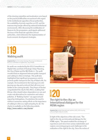 Walking audit An audit was conducted by the UCLG Committee on Digital Cities and that of Strategic Urban Planning, the City of Rabat and the NGO Walk 21. The audit revealed that an alignment between public transport and walking in cities is strategic. This audit also highlighted that significant programmes exist to promote public transport in the city of Rabat with, for example, the investment in the tramway (172,000 journeys per day and a network that will cover over 400km in the coming decade). They Mayor of Durban congratulated the city for this effort, recalling that African cities should reduce dependence on cars and create real alternatives for commuters and reduce pollution. A “Walking Charter” was approved and signed by 8 delegations. It underlines the need to reinforce awareness raising efforts on the importance of walking in cities as a right and policy for all. The charter is available on the following website. http://www.walk21.com/charter