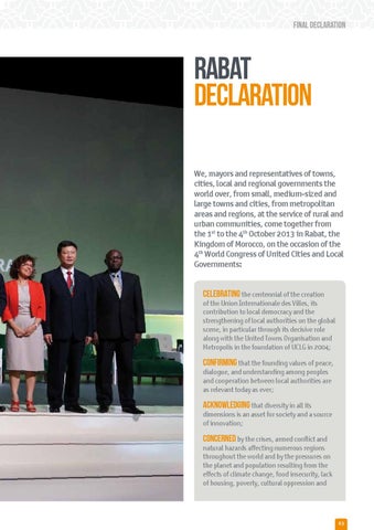 RABAT DECLARATION We, mayors and representatives of towns, cities, local and regional governments the world over, from small, medium-sized and large towns and cities, from metropolitan areas and regions, at the service of rural and urban communities, come together from the 1st to the 4th October 2013 in Rabat, the Kingdom of Morocco, on the occasion of the 4th World Congress of United Cities and Local Governments: