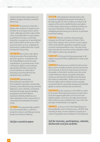 ASSESSING with satisfaction that the democratic revolutions highlighted during the Declaration of the Jeju Congress in 2007 continue to extend in all regions of the world, mindful that the local sphere is where these democracies are built and reinforced, and aware that forms of citizen participation are multiplying and becoming more diverse, in particular in decision making; CONSCIOUS that the world has witnessed major changes since the last Congress in Mexico City in 2010, these changes raise concerns in some regions of the world with the apparition of political, social, economic and humanitarian crises. They also bring hope and raise the awareness of the population about their rights to democracy and justice;