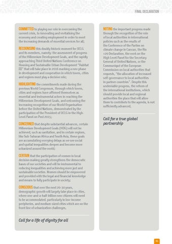 COMMITTED to playing our role in overcoming the current crisis, to innovating and revitalising the economy and creating employment in order to meet the increasing demands of essential services for all; RECOGNISING this doubly historic moment for UCLG and its members, namely: the assessment of progress of the Millennium Development Goals, and the rapidly approaching Third United Nations Conference on Housing and Sustainable Urban Development “Habitat III” that will take place in 2016 marking a new phase in development and cooperation in which towns, cities and regions must play a decisive role;
