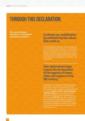 Continue our mobilization by maintaining the values that unite us In the international context of crises and conflict and at a time of democratic development, we wish to place peace and development at the centre of our action, to thereby contribute to renewing democracy from the local level up and to engage directly with the youth to involve them in the development of their towns, cities and territories.