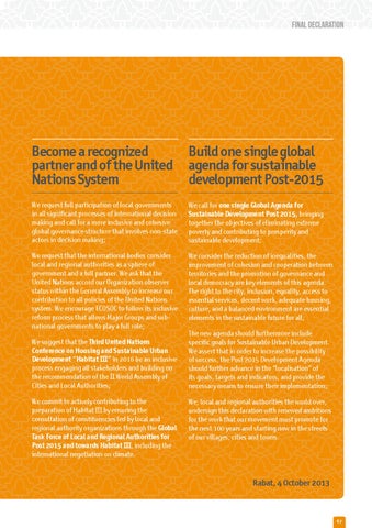 The new agenda should furthermore include specific goals for Sustainable Urban Development. We assert that in order to increase the possibility of success, the Post 2015 Development Agenda should further advance in the “localisation” of its goals, targets and indicators, and provide the necessary means to ensure their implementation; We, local and regional authorities the world over, undersign this declaration with renewed ambitions for the work that our movement must promote for the next 100 years and starting now in the streets of our villages, cities and towns.