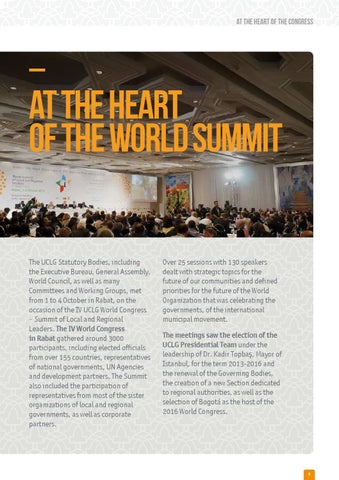 At the heart of the WORLD SUMMIT The UCLG Statutory Bodies, including the Executive Bureau, General Assembly, World Council, as well as many Committees and Working Groups, met from 1 to 4 October in Rabat, on the occasion of the IV UCLG World Congress – Summit of Local and Regional Leaders. The IV World Congress in Rabat gathered around 3000 participants, including elected officials from over 155 countries, representatives of national governments, UN Agencies and development partners. The Summit also included the participation of representatives from most of the sister organizations of local and regional governments, as well as corporate partners.