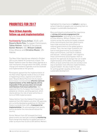 PRIORITIES FOR 2017 New Urban Agenda follow-up and implementation Facilitated by Yunus Arikan, ICLEI, with Rosario Bento Pais, European Commission; Tobias Kettner, Habitat III Secretariat; Günter Meinert, GIZ; William Cobbett, Cities Alliance and Christine Musisi, UNHabitat. The New Urban Agenda was adopted in October 2016 at the Habitat III Conference in Quito. The Global Taskforce sees the New Urban Agenda as a vital mechanism through which the SDGs, climate change and resilience agendas must be localized and implemented on the ground. Participants agreed that the implementation of the New Urban Agenda needs to focus on what is happening at local, regional and national level. Rosario Bento Pais from the European Commission mentioned that effective national implementation of the 2030 Agenda will be impossible if this process does not include contributions from local authorities. She explained that the European Commission has adopted an initiative, pending approval, which clearly defines the role of local authorities in terms of SDG implementation. Tobias Kettner from the Habitat III Secretariat explained that UN-Habitat and other UN agencies are currently developing guidelines for Member States to provide them with a framework for implementation. He acknowledged that results tend to be better the more decentralized the country. Günter Meinert from GIZ stressed that local governments can best get involved by monitoring local change and relaying it to global partners in order to ensure that no one is left behind. Meinert