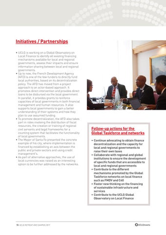 Follow-up actions for the Global Taskforce and networks • Continue advocating to obtain finance decentralization and the capacity for local and regional governments to raise their own taxes • Collaborate with regional and global institutions to ensure the development of specific funds that are accessible to local and regional governments • Contribute to the different mechanisms promoted by the Global Taskforce networks on local finance such as FMDV and C40 • Foster new thinking on the financing of sustainable infrastructure and services • Contribute to the UCLG Global Observatory on Local Finance