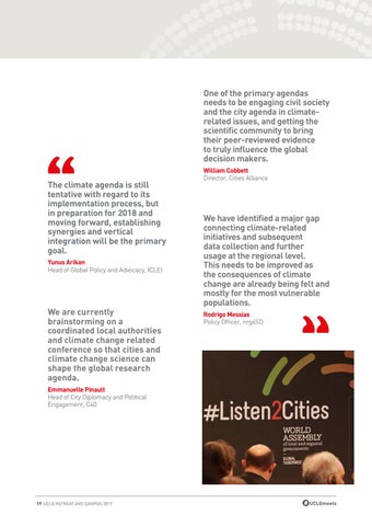 One of the primary agendas needs to be engaging civil society and the city agenda in climaterelated issues, and getting the scientific community to bring their peer-reviewed evidence to truly influence the global decision makers. The climate agenda is still tentative with regard to its implementation process, but in preparation for 2018 and moving forward, establishing synergies and vertical integration will be the primary goal. Yunus Arikan Head of Global Policy and Advocacy, ICLEI