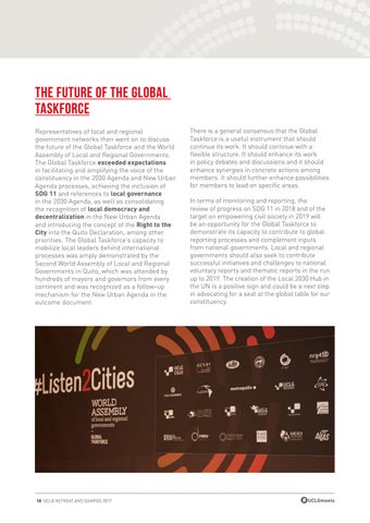 The future of the Global Taskforce Representatives of local and regional government networks then went on to discuss the future of the Global Taskforce and the World Assembly of Local and Regional Governments. The Global Taskforce exceeded expectations in facilitating and amplifying the voice of the constituency in the 2030 Agenda and New Urban Agenda processes, achieving the inclusion of SDG 11 and references to local governance in the 2030 Agenda, as well as consolidating the recognition of local democracy and decentralization in the New Urban Agenda and introducing the concept of the Right to the City into the Quito Declaration, among other priorities. The Global Taskforce’s capacity to mobilize local leaders behind international processes was amply demonstrated by the Second World Assembly of Local and Regional Governments in Quito, which was attended by hundreds of mayors and governors from every continent and was recognized as a follow-up mechanism for the New Urban Agenda in the outcome document.