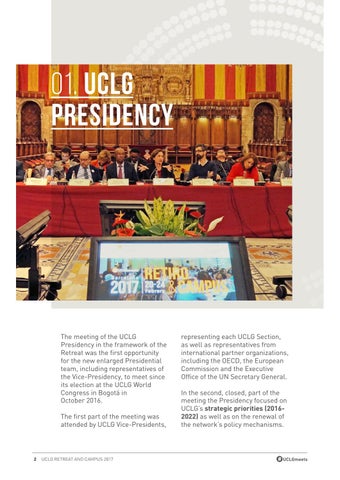representing each UCLG Section, as well as representatives from international partner organizations, including the OECD, the European Commission and the Executive Office of the UN Secretary General. In the second, closed, part of the meeting the Presidency focused on UCLG’s strategic priorities (20162022) as well as on the renewal of the network’s policy mechanisms.