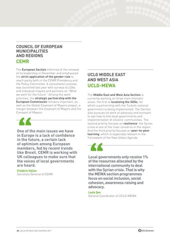 UCLG-MEWA The Middle East and West Asia Section is currently working on three main thematic areas: the first is localizing the SDGs, for which a partnership with the Turkish national government is being implemented. The Section also pursues its work of advocacy and outreach to see how to link local governments and implementation of citizens’ communities. The second priority focuses on resilience: the Syrian crisis is one of the main concerns in the region. And the third priority focuses on peer-to-peer learning, which is especially relevant in the framework of the New Urban Agenda.