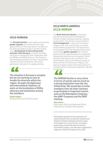 UCLG-NORAM UCLG-EURASIA The Eurasian Section is also looking at achieving gender equality and mentioned they made special efforts to nominate women members to the Statutory Bodies of UCLG. Another priority is the development of links with partners and other UCLG Sections; the World Heritage Conference now benefits from cooperation with the MEWA and ASPAC Sections. The Section is also developing research on cities’ international activities and will compile the information gathered to translate it into good practices.