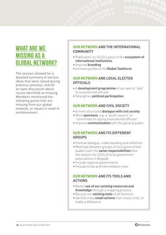 What are we missing as a global network? The session allowed for a detailed summary of various ideas that were raised during previous sessions, and for an open discussion about issues identified as missing. Members mentioned the following points that are missing from our global network, or issues in need of reinforcement:
