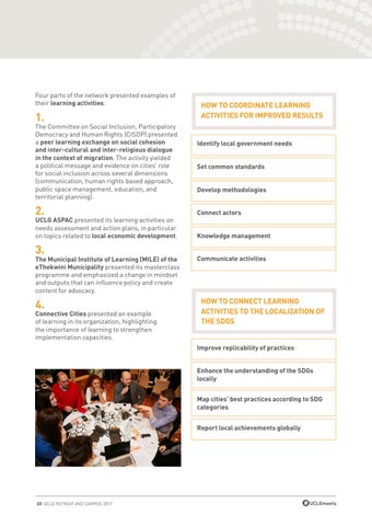 HOW TO CONNECT LEARNING ACTIVITIES TO THE LOCALIZATION OF THE SDGS Improve replicability of practices Enhance the understanding of the SDGs locally Map cities’ best practices according to SDG categories Report local achievements globally