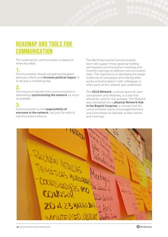 The World Secretariat Communication team will support these goals by holding participatory communication meetings and monthly trainings on different communication tools. The importance of identifying the target audiences of campaigns and sharing what works and what doesn’t with colleagues in other parts of the network was underlined. The UCLG Network, a virtual space for joint consultation and initiatives, is a tool that should be used for this purpose. The Network was translated into a physical Network Hub in the Bogotå Congress, a concept that the communication teams encouraged Sections and Committees to replicate at their events and meetings.
