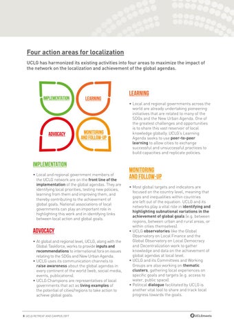 Four action areas for localization UCLG has harmonized its existing activities into four areas to maximize the impact of the network on the localization and achievement of the global agendas.
