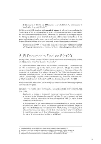 5. El Documento Final de Río+20 Los siguientes párrafos proveen un análisis sobre el contenido relacionado con la cultura en el Documento Final (Final Outcome Document).26 “El futuro que queremos” es el nombre del Documento Final de Río +20. Está estructurado en estas seis secciones. (I) Nuestra Visión Común, párrafos 1-13; (II) Renovación del compromiso político, párrafos 14-55; (III) Una economía verde en el contexto del desarrollo sostenible y la erradicación de la pobreza, párrafos 56-74; (IV) Marco institucional para el desarrollo sostenible, párrafos 75-103; (V) Marco para la acción y el seguimiento, párrafos 104-251, con dos largas secciones sobre “Esferas temáticas y cuestiones intersectoriales” y “Objetivos de Desarrollo Sostenible”, (VI) Medios de ejecución, párrafos 252-283. El documento final menciona la cultura en algunos párrafos. Identifiquémoslos y hagamos comentarios al respecto. SECCIONES I Y II: NUESTRA VISIÓN COMÚN (PAR 1-13) Y RENOVACIÓN DEL COMPROMISO POLÍTICO (PAR 14-55).