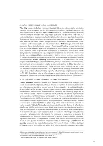 Vitor Ortiz, ministro de Cultura interino de Brasil, abrió la sesión subrayando las principales medidas estructurales de las dos últimas administraciones de Brasil respecto a la institucionalización de la cultura. Ticio Escobar, ministro de Cultura de Paraguay, reflexionó sobre la intrincada relación entre las políticas culturales y el desarrollo sostenible. “La sostenibilidad es un paradigma cultural implícito, ahora tenemos que hacerlo explícito. Tenemos que demostrar la forma en que la cultura organiza a la sociedad, y trasciende a otras áreas del desarrollo. Genera integración social, conciencia medioambiental y más economías sostenibles dirigidas por industrias creativas.” Anders Knape, presidente de la Asociación Sueca de Autoridades Locales y Regionales (SALAR), y concejal de Karlstad (Suecia), previno sobre los peligros de la inactividad e hizo un llamado a la responsabilidad local y regional. “Sería un grave error no reconocer la importancia de la cultura a nivel local y regional, y tan sólo esperar a que los gobiernos nacionales y la comunidad internacional decidan por nosotros qué hacer a continuación. Nosotros mismos podemos hacer mucho. Ya contamos con las herramientas necesarias. Sólo tenemos que perfeccionarlas y hacerlas más sostenibles.” Gerald Tremblay, vicepresidente de CGLU para América del Norte, vicepresidente de Metrópolis y alcalde de Montreal, concluyó la sesión con un video mensaje. Montreal fue la primera ciudad en adoptar la declaración política de CGLU “La cultura es el cuarto pilar del desarrollo sostenible”. Desde entonces, muchos otros gobiernos locales han adoptado compromisos similares. Con la legitimidad del liderazgo de Montreal en el campo de las políticas culturales, Tremblay exigió: “La cultura tiene que ser plenamente reconocida en Río+20.” Después de todo, la cultura juega un papel crucial en el desarrollo humano responsable “para preservar la identidad y la diversidad, tanto local como globalmente.”36 III. LOS CONTENIDOS DE LA RELACIÓN ENTRE CULTURA Y SOSTENIBILIDAD