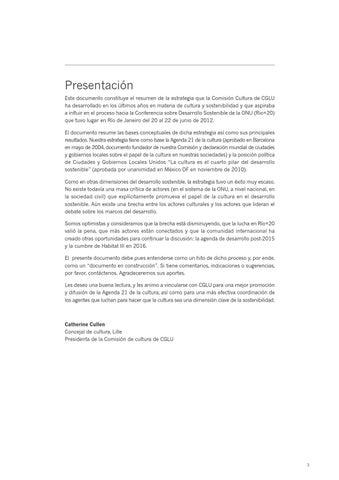 Presentación Este documento constituye el resumen de la estrategia que la Comisión Cultura de CGLU ha desarrollado en los últimos años en materia de cultura y sostenibilidad y que aspiraba a influir en el proceso hacia la Conferencia sobre Desarrollo Sostenible de la ONU (Rio+20) que tuvo lugar en Río de Janeiro del 20 al 22 de junio de 2012. El documento resume las bases conceptuales de dicha estrategia así como sus principales resultados. Nuestra estrategia tiene como base la Agenda 21 de la cultura (aprobado en Barcelona en mayo de 2004, documento fundador de nuestra Comisión y declaración mundial de ciudades y gobiernos locales sobre el papel de la cultura en nuestras sociedades) y la posición política de Ciudades y Gobiernos Locales Unidos “La cultura es el cuarto pilar del desarrollo sostenible” (aprobada por unanimidad en México DF en noviembre de 2010). Como en otras dimensiones del desarrollo sostenible, la estrategia tuvo un éxito muy escaso. No existe todavía una masa crítica de actores (en el sistema de la ONU, a nivel nacional, en la sociedad civil) que explícitamente promueva el papel de la cultura en el desarrollo sostenible. Aún existe una brecha entre los actores culturales y los actores que lideran el debate sobre los marcos del desarrollo. Somos optimistas y consideramos que la brecha está disminuyendo, que la lucha en Río+20 valió la pena, que más actores están conectados y que la comunidad internacional ha creado otras oportunidades para continuar la discusión: la agenda de desarrollo post-2015 y la cumbre de Habitat III en 2016. El presente documento debe pues entenderse como un hito de dicho proceso y, por ende, como un “documento en construcción”. Si tiene comentarios, indicaciones o sugerencias, por favor, contáctenos. Agradeceremos sus aportes. Les deseo una buena lectura, y les animo a vincularse con CGLU para una mejor promoción y difusión de la Agenda 21 de la cultura, así como para una más efectiva coordinación de los agentes que luchan para hacer que la cultura sea una dimensión clave de la sostenibilidad.