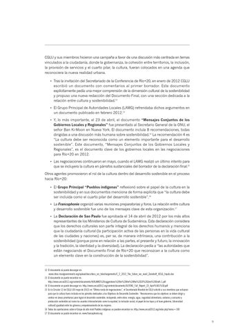 12 El documento se puede descargar en: www.cities-localgovernments.org/upload/docs/docs_en_telechargements/C_2_2012_The_future_we_want_Zerodraft_UCLG_Inputs.doc 13 El documento se puede encontrar en: http://www.uncsd2012.org/content/documents/469LAMG%20suggestions%20for%20the%20Rio%2020%20Zero%20Draft-1.pdf 14 El documento se puede descargar en: http://www.uncsd2012.org/content/documents/567ENG_Full_Report_23_April%5B1%5D.pdf 15 En la Circular 12 de CGLU (30 mayo de 2012) en “Última ronda de negociaciones”, el Secretariado Mundial de CGLU solicitó a sus miembros que actuaran para que la cultura fuera incluida en los párrafos dedicados a los Objetivos de Desarrollo Sostenible. “Reconocemos que los objetivos se deben dirigir y centrar en áreas prioritarias para lograr el desarrollo sostenible, incluyendo, entre otros: energía, agua, seguridad alimentaria, océanos y consumo y producción sostenible así como los asuntos intersectoriales como la equidad, la inclusión social, el papel de las leyes y el buen gobierno, [diversidad cultural] igualdad entre los géneros y empoderamiento de las mujeres. 16 Todas las aportaciones sobre el Grupo de alto nivel Pueblos indígenas se pueden encontrar en: http://www.uncsd2012.org/index.php?menu=100 17 El documento se puede encontrar en: www.francophonie.org 9